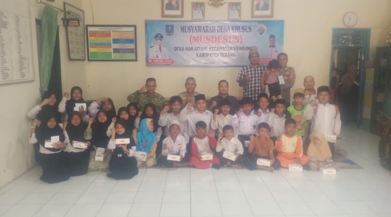 POLRESTA SERKOT_ Anggota Polsek Kramatwatu Polrestaserkot melaksanakan kegiatan pemberian santunan anak yatim sebanyak 35 orang di desa Harjatani kec.kramatwatu Daerah Hukum Polresta Serkot Polda Banten pada,sabtu (18/4/2026).