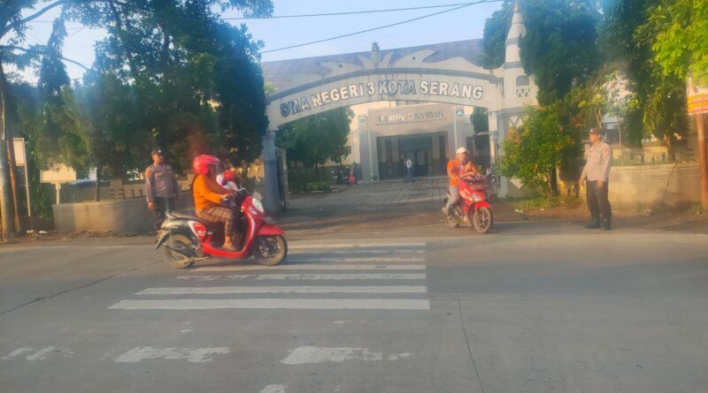 Gatur Sore Hari antisipasi kemacetan, Anggota Polsek Taktakan Polresta Serkot Berikan Kelancaran Di Depan SMAN 3 Kota Serang.